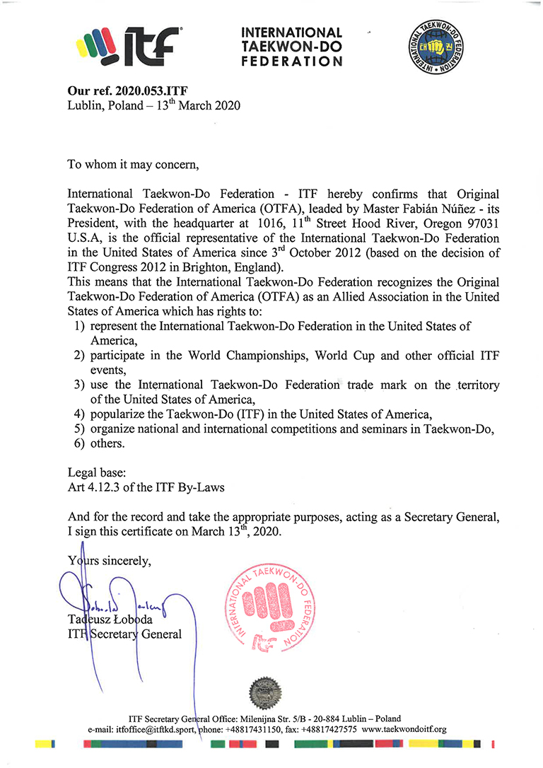The Original Taekwon-Do Federation of America is confirmed to be an official representative of the International Taekwon-Do Federation in the United States of America and is recognized by the International Taekwon-Do Federation as an Allied Association.